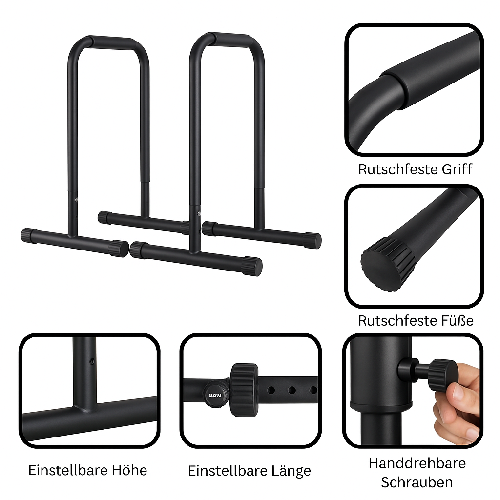 Die Dip Barren sind die perfekte Ergänzung zu meinem HomeGym. Qualitativ machen sie einen guten Eindruck - und durch die individuellen Verstellmöglichkeiten sind viele verschiedene Übungen möglich. Auch mit höherem Gewicht kann man die Dip-Station problemlos nutzen. Bin rundum zufrieden. Sport frei!