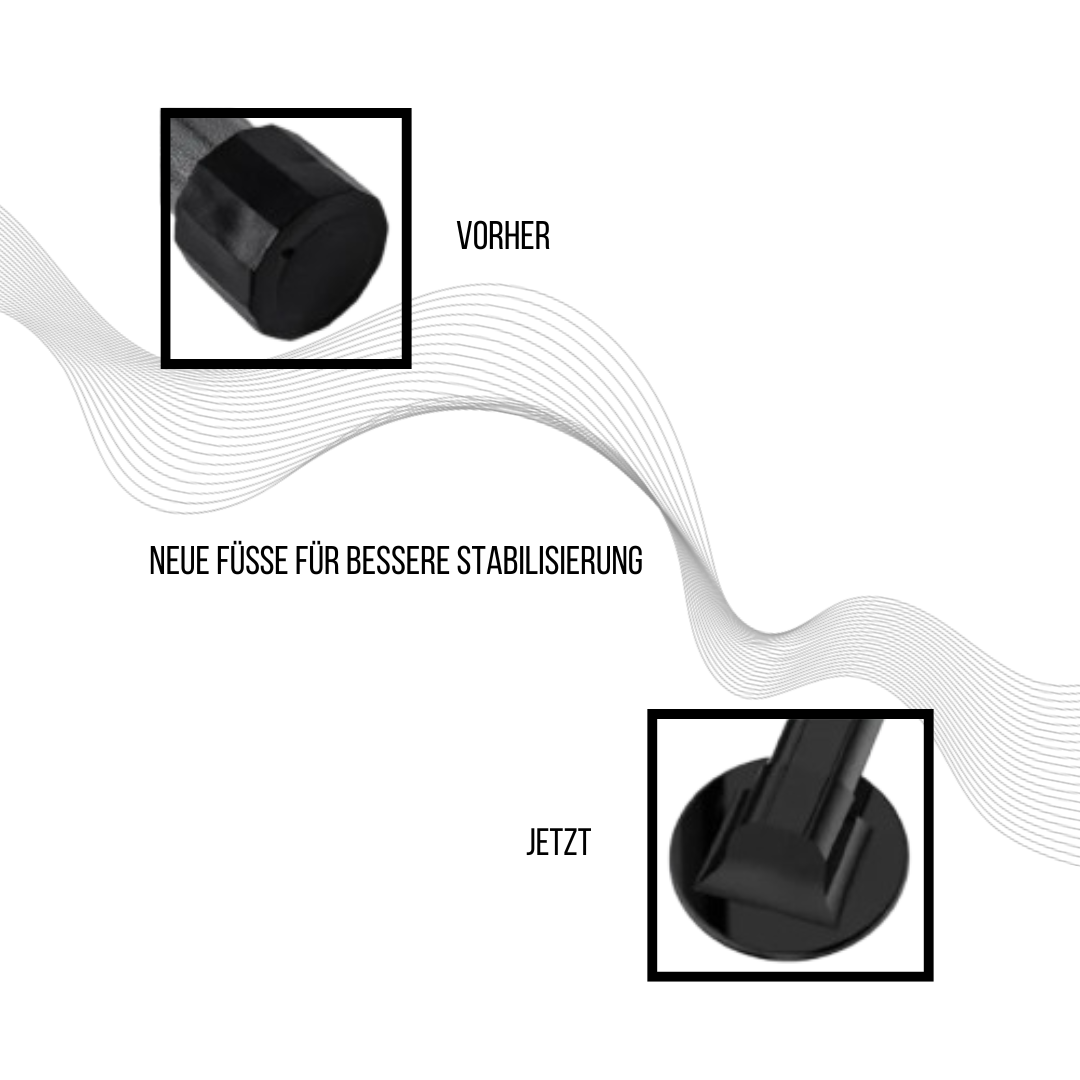 Unser Entwicklungsteam nahm die Herausforderung an und entwarf Füße mit breiterer Standfläche und rutschfesten Materialien. Das Ergebnis: maximale Stabilität für ein sicheres und konzentriertes Training, inspiriert durch dein Feedback!